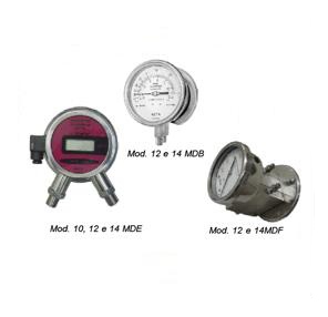 - Modelo 14 MDB = Ø150mm, com tubo bourdonrrosivos, processos gasosos ou líquidos. Indicados para medição de pressões diferenciais entre duas pressões de forma direta ou para medição indireta de nível ou de vazão.